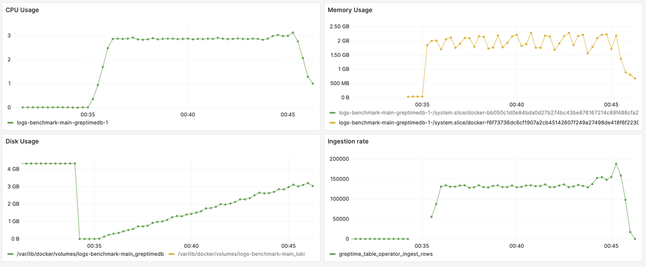• CPU Utilization: GreptimeDB averages 30%-35% CPU usage, comparable to Loki's 33.75%, indicating similar compute efficiency.