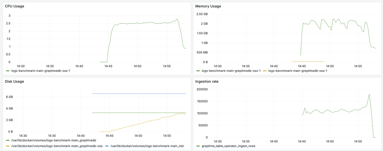 • Memory Consumption: GreptimeDB's average memory usage (1.75GB-1.9GB) is moderately higher than Loki's (about 1.4GB). Peak memory usage for both stabilizes around 2.1GB, showing minimal divergence.