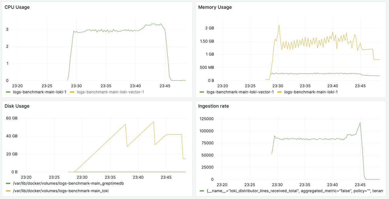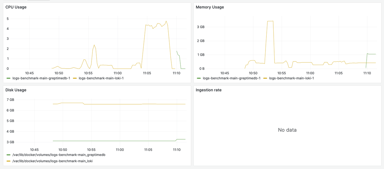 In the chart, the yellow line represents Loki's resource utilization, while the green line corresponds to GreptimeDB.